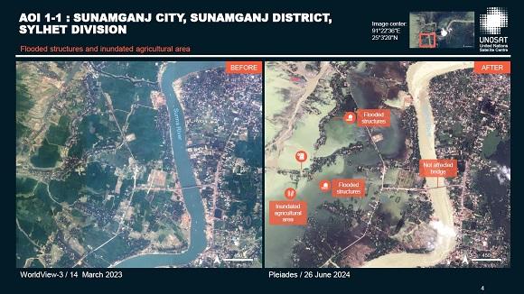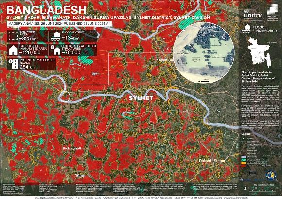 Much of the Sylhet district (75 percent), including over half the area's crops and paddy fields, are submerged, threatening livelihoods and food security.