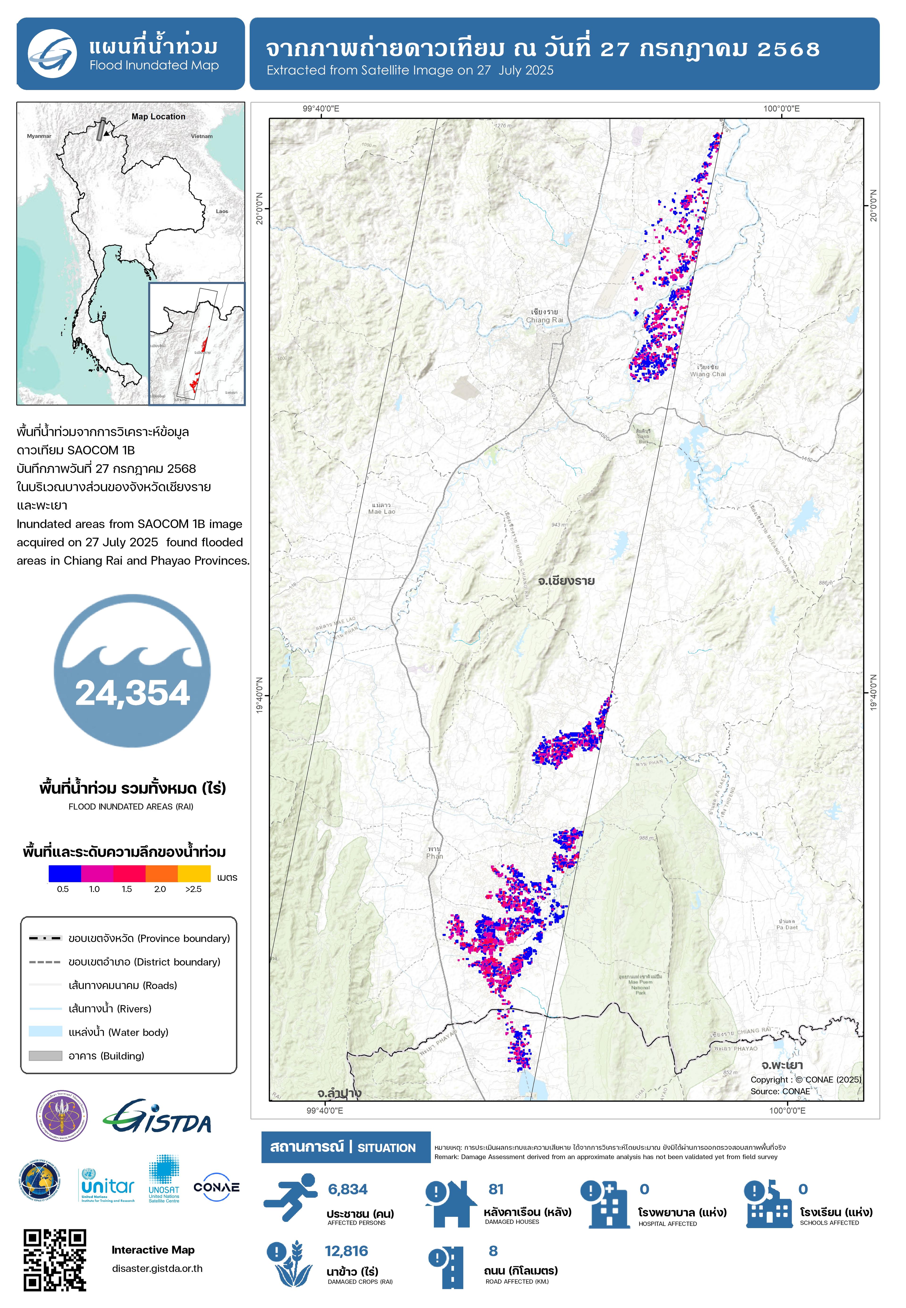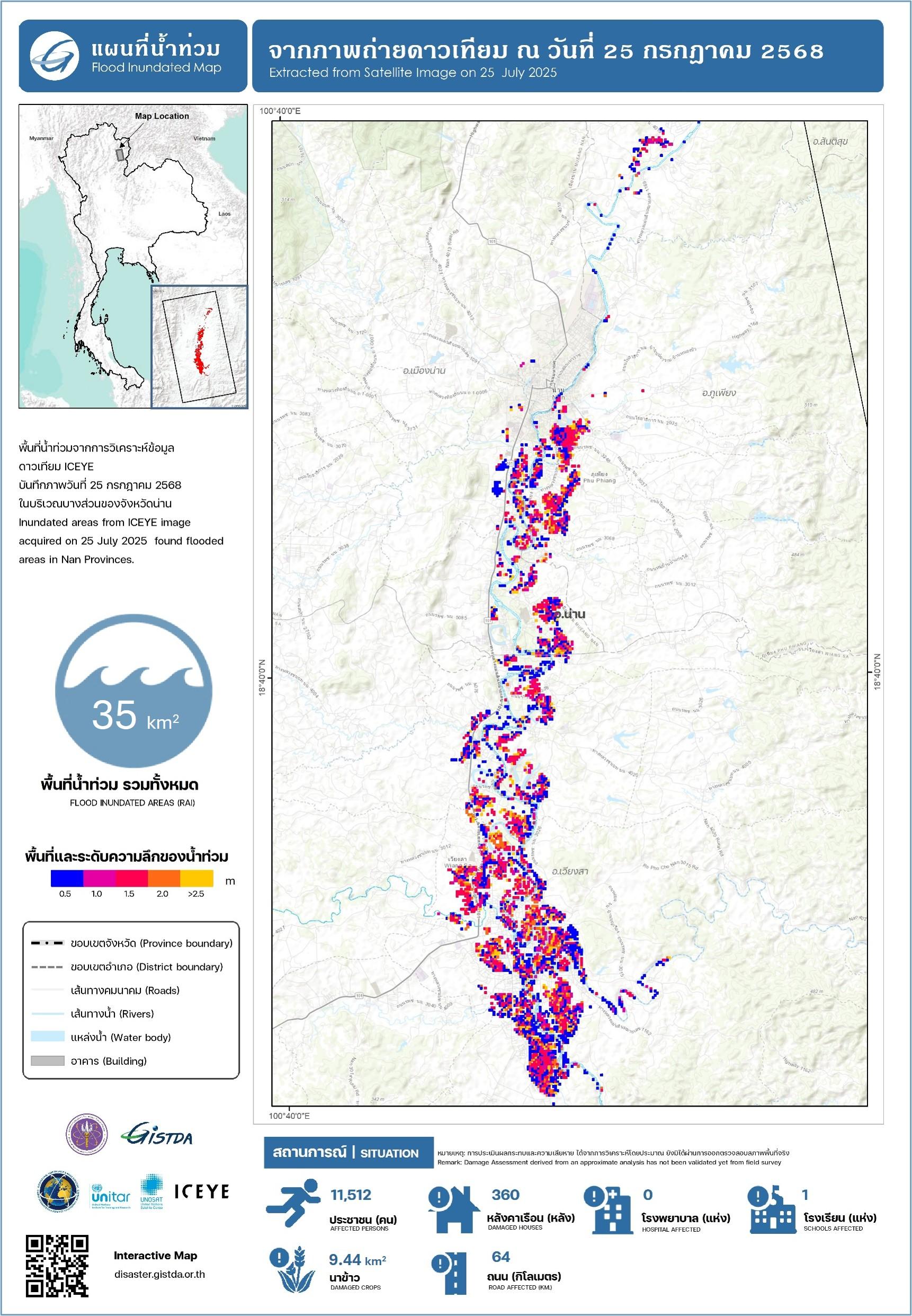 Tropical Cyclone Wipha brought sustained heavy rainfall to northern Thailand in July 2025, causing widespread flooding across several provinces. Nan was among the hardest hit, receiving 150–200 mm of rain that overwhelmed rivers and drainage systems. Floodwaters inundated residential areas, forced school closures, and isolated communities in districts such as Bo Kluea, Chiang Klang, Muang, and Pua.